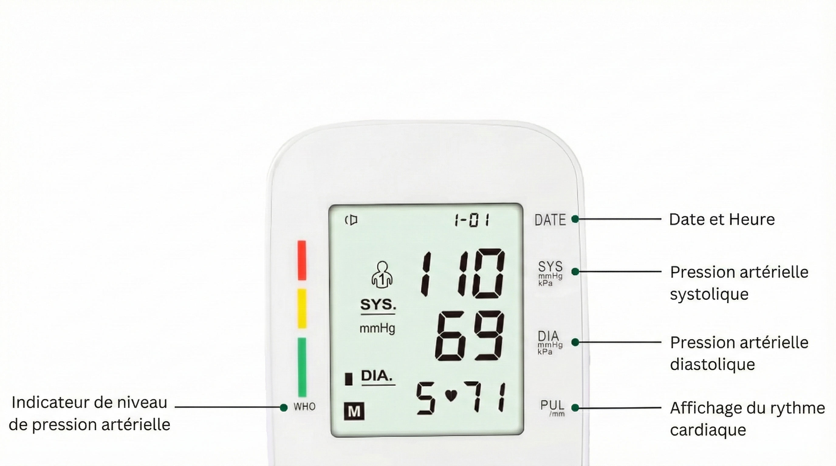 Le grand écran bien lisible affiche vos valeurs en temps réel. La tension et la fréquence cardiaque apparaissent clairement à l'écran. L'utilisation est particulièrement simple grâce aux grandes touches.